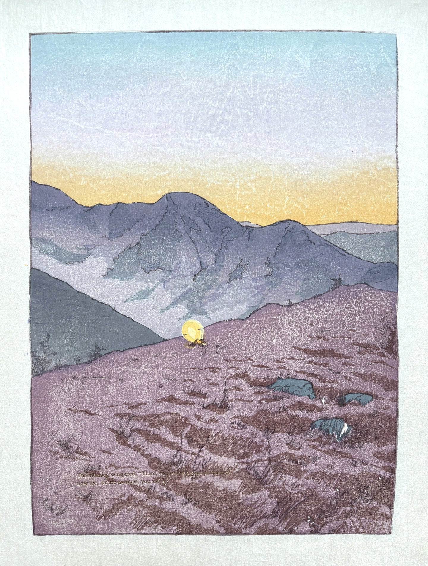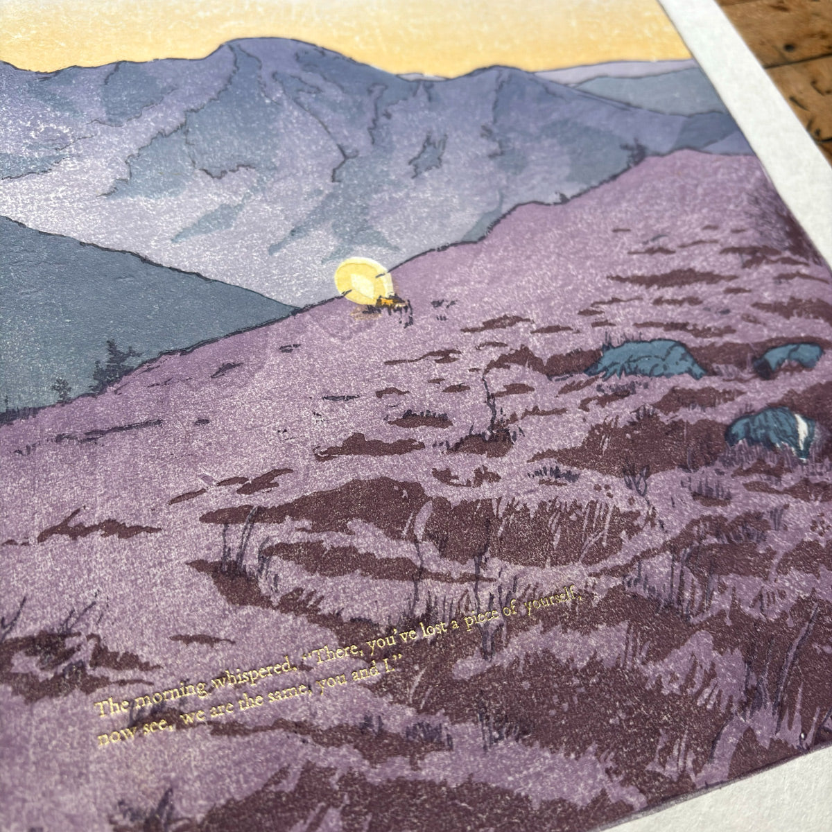 Media: Mokuhanga (traditional Japanese water-based multi-block woodcut print) with hand-set letterpress type in gold.